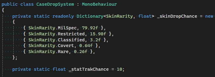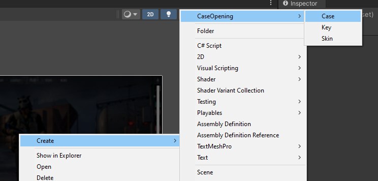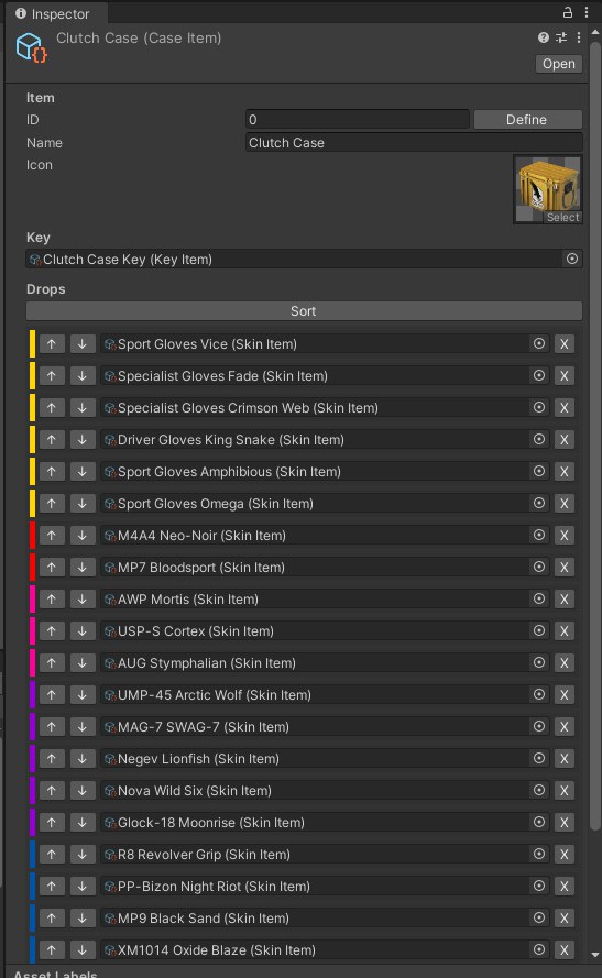 This Unity asset adds a full-featured case opening system to your game, inspired by CS:GO. Players can open cases to receive weapon skins with random rarity, StatTrak options, and float values. The system also provides inventory management, visual case rolling, and console commands for testing and debugging.