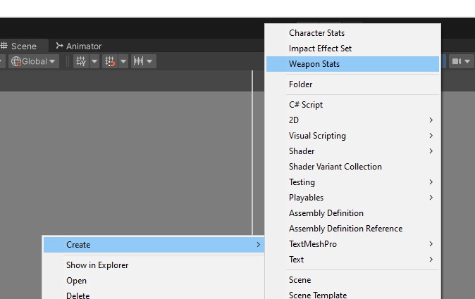 To create a weapon, character, or Impact Effect Set: right-click in any convenient project folder, then choose “Create”, as shown in the image below.